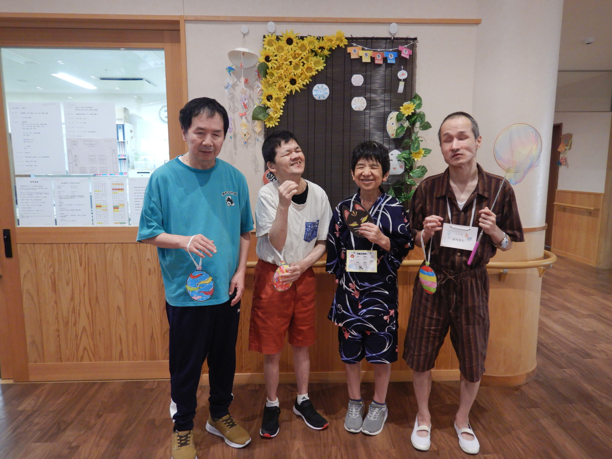 利用者の皆様は浴衣や甚平に着替えて、手形アートやお菓子釣りなどをして楽しみました。夏の良い思い出となりました。