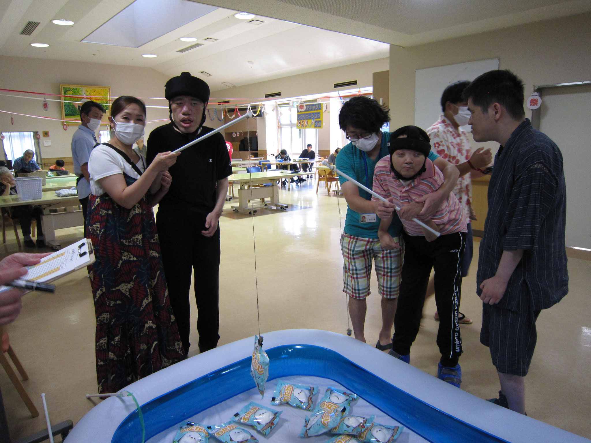 利用者の皆様に千本釣りや輪投げで景品をゲットしていただきました!皆様違った景品で「やったー!」「嬉しい!」などとてもいい笑顔で喜んでくださいました。綿あめを作ったり、焼きそばや焼き鳥、きゅうりの一本漬けを食べたりと夏祭りらしい1日を過ごす事ができました。