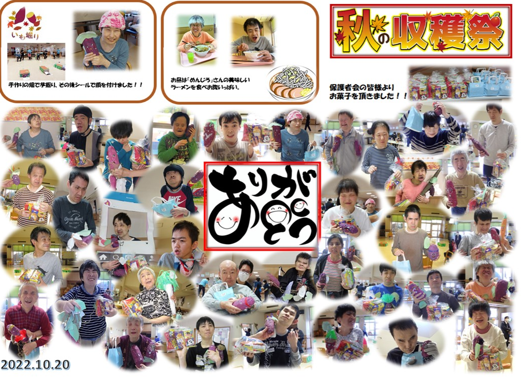 保護者会からお菓子のプレゼントを頂き、利用者さんみんな大喜び。お昼は水戸のラーメン屋「めんじろ」さんに来ていただき美味しく頂きました。秋晴れの中、外で仲良くデザート・焼き芋も楽しめ最高の一日でした。