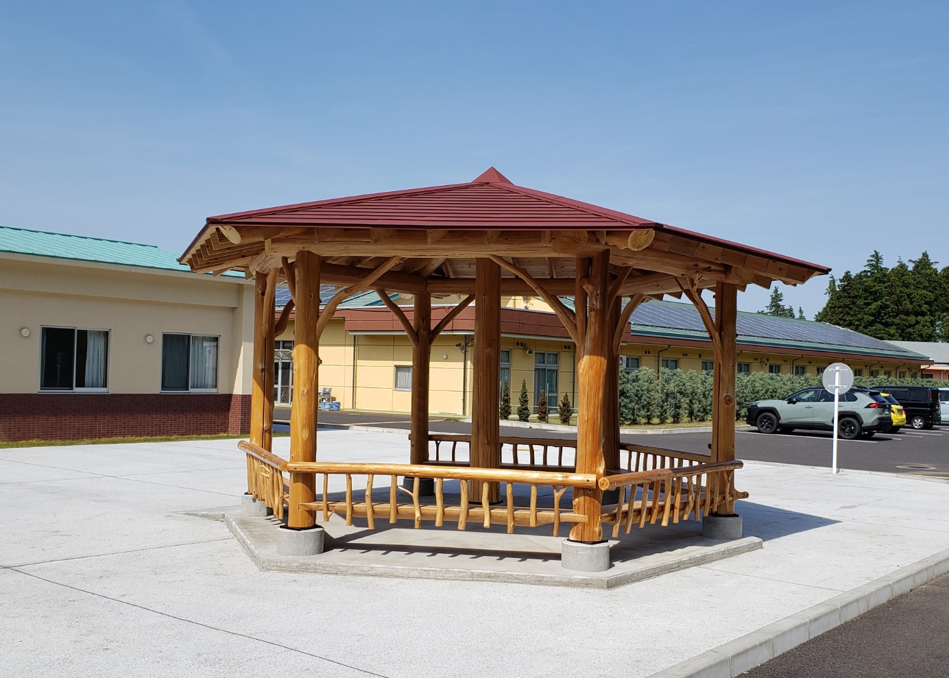 新光風荘南側に東屋が完成しました。これから利用者さんの笑顔あふれる憩いの場にしたいと思っています。