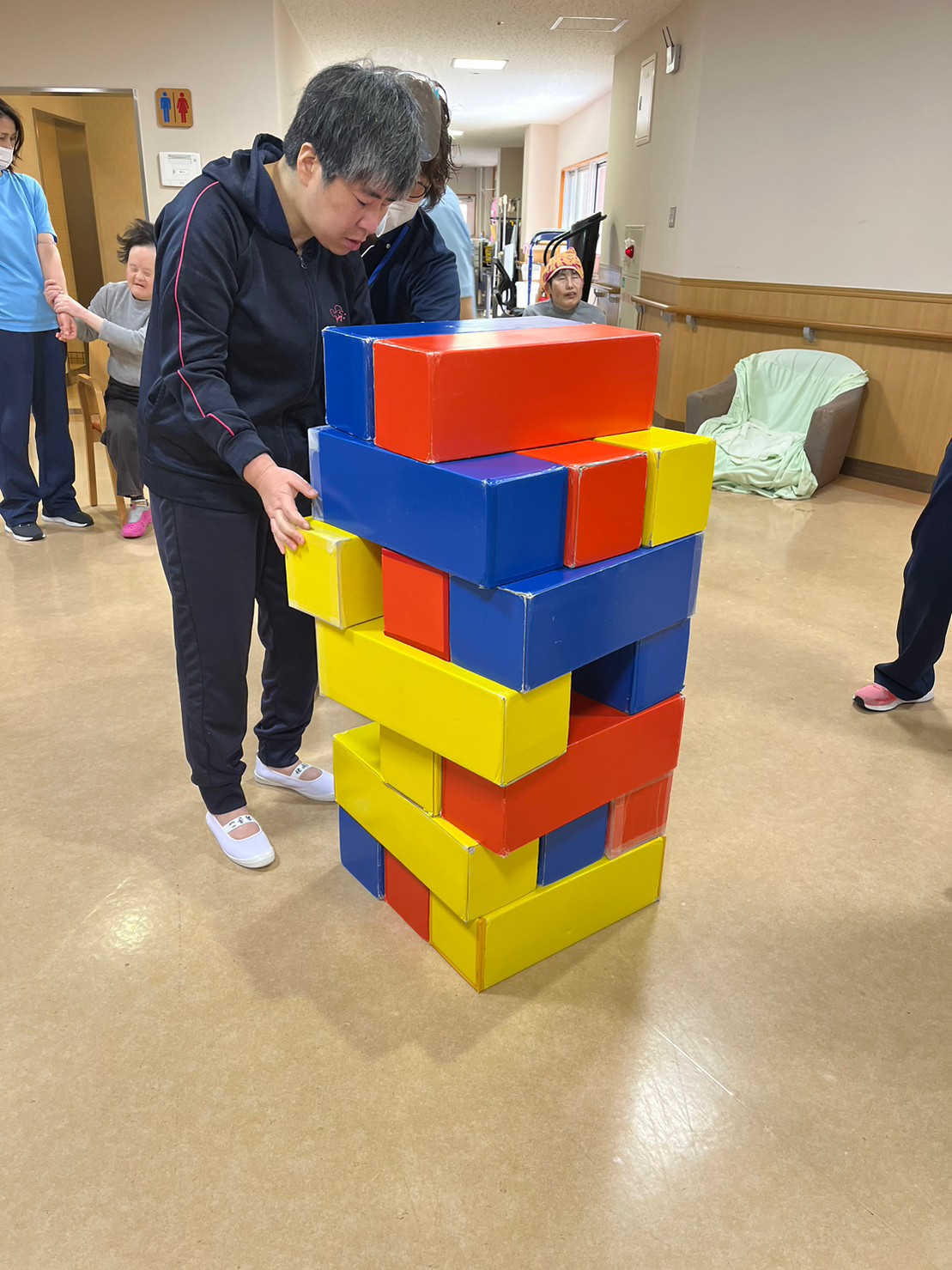 ジェンガ、ボウリング、ゲームをみんなで楽しみました。天気も良く、新緑もまぶしい中、敷地内の歩行も利用者さんに喜んで頂きました。引き続き新型コロナの感染に注意しながら、利用者さんに楽しんで頂けるよう取り組んで行きたいと思います。