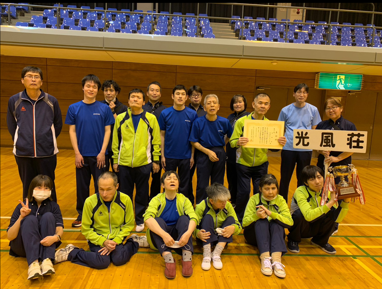 秋晴れのなか市スポに、光風荘・光風荘アネックス合同チームとして参加してきました。ボウリング・玉入れ・リレー・綱引き・パン食い競争・ボール送りなど真剣勝負を繰り広げてきました。結果は見事優勝。光風荘チームに入ってくれた学生ボランティアさんと共に喜びを分かち合いました。疲れましたが最高に楽しい一日でした。